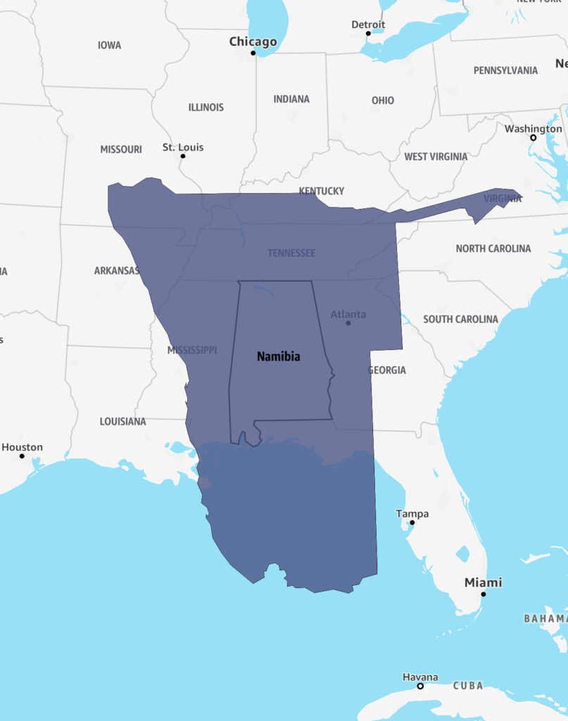 Namibia is approximately 824,292 sq km, while Alabama is approximately 131,426 sq km, making Alabama 15.94% the size of Namibia. Meanwhile, the population of Namibia is ~2.7 million people (2.1 million more people live in Alabama). We have positioned the outline of Namibia near the middle of Alabama.
